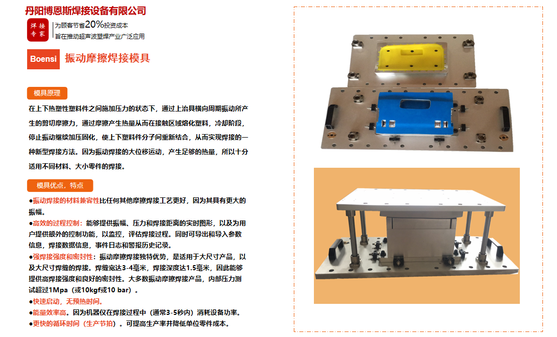 丹陽博恩斯焊接設備有限公司是塑料焊接領域集研發設計、生產制造、銷售服務為一體的企業。公司自成立以來堅持“以人為本”的理念,組織了一支強大的技術研發團隊,攜多年來積累的豐富經驗,并結合國際先進塑料焊接技術,根據市場需要,不斷開發具有核心競爭力的新產品。公司具有很強的非標機械研發、設計、生產能力,可為廣大客戶定制各類專用機械設備。公司設計生產的塑料焊接設備已廣泛應用于汽車、電子、家電、醫療器械、無紡布...